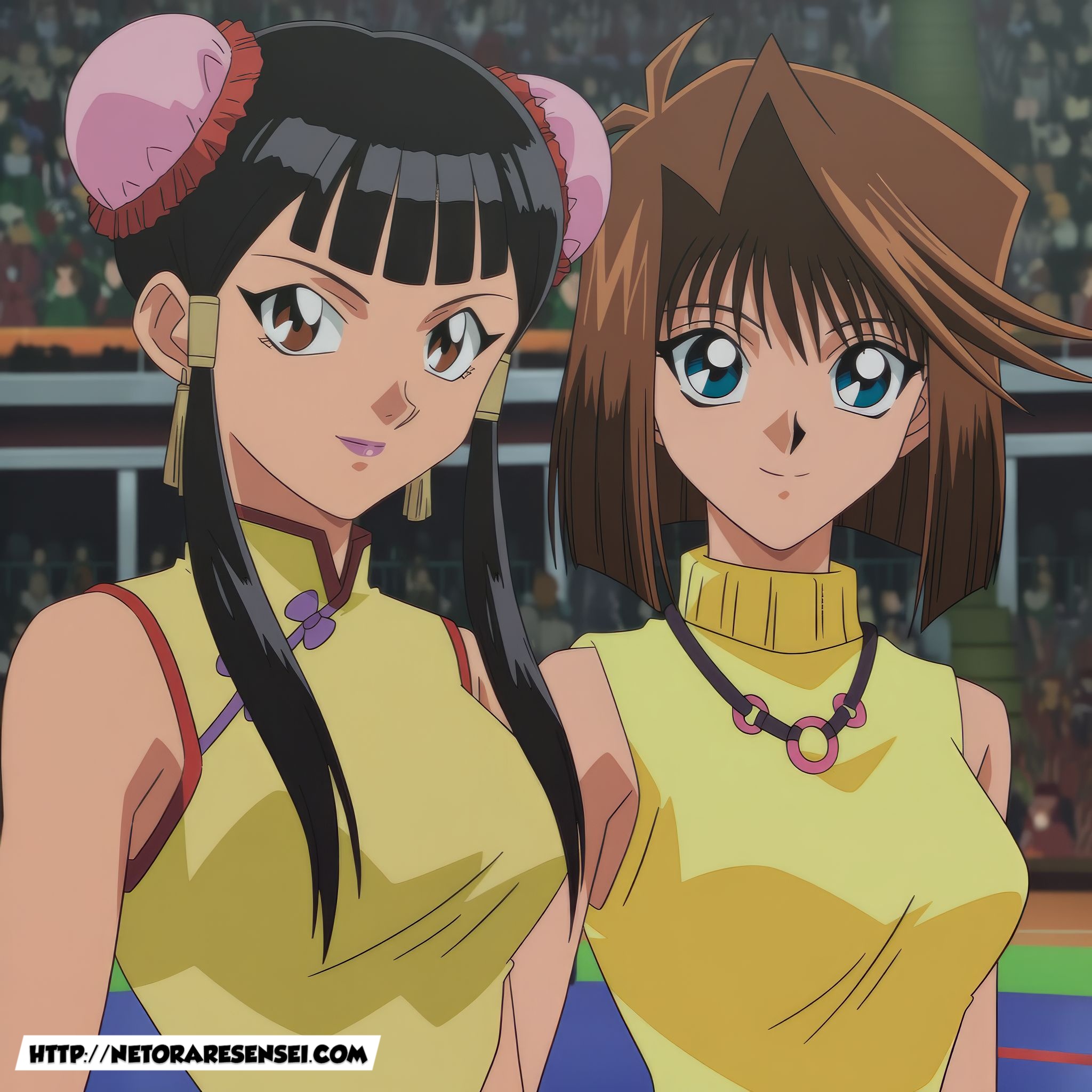 In the heat of a high-stakes duel at Domino City Arena, Vivian Wong smirks across the table from Anzu Mazaki, their cards clashing in fierce strategy. As the game intensifies, Vivian calls upon powerful allies who dominate the field. Shocked and trembling, Anzu watches as Vivian revels in her strategic victory, guiding her hesitant friend into the thrill of shared surrender, culminating in a chaotic conclusion that disrupts their intense duel.